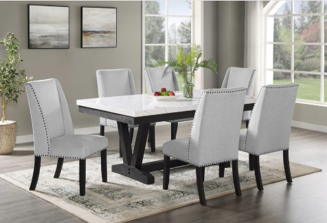 This stainless steel dining set gives a nice touch to your dining spaces. The dining table is crafted of genuine grey marble with a gleaming silver finish accenting the stainless steel base. Dining chairs feature a seamless silver stainless steel frame on top of the chairs and silver stainless steel legs.
