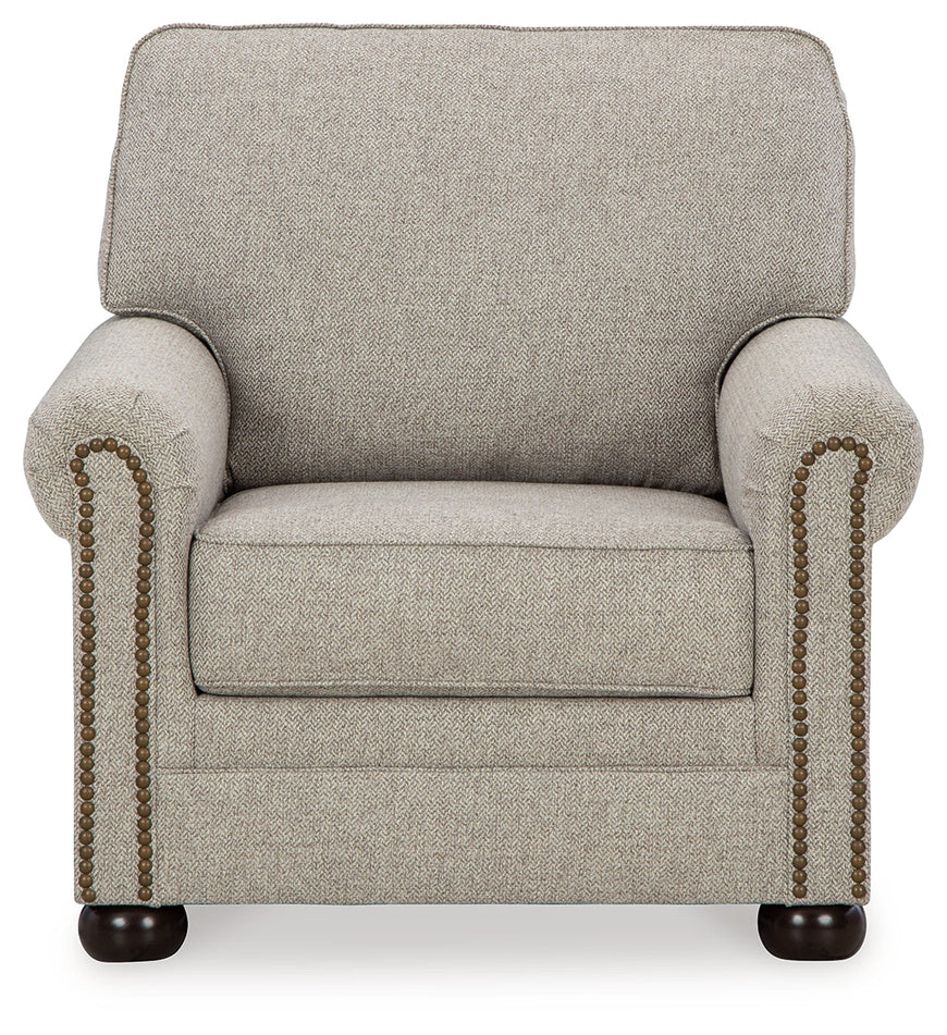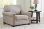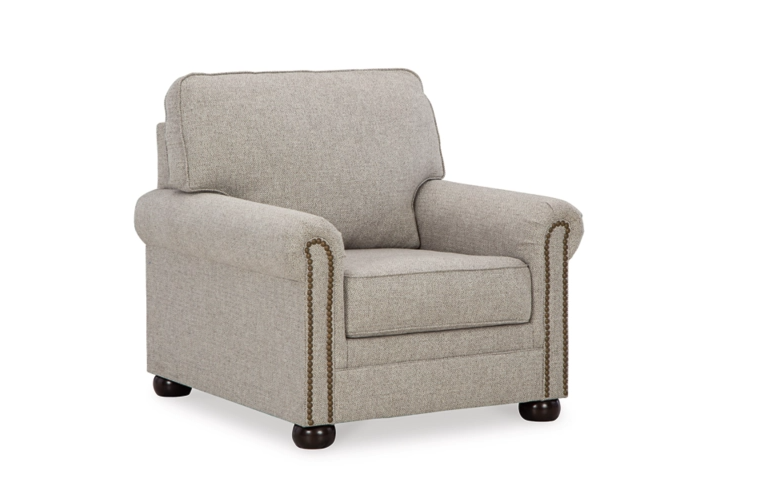 Inspired by the past but rooted firmly in the present, this chair complements your transitional seating area. Its versatile upholstery is delightfully detailed for a subtle herringbone effect. Designer touches like decorative nailhead trim and bun legs add traditional character. With this chair’s reliable style and comfort, all you need to do is sit back and relax.