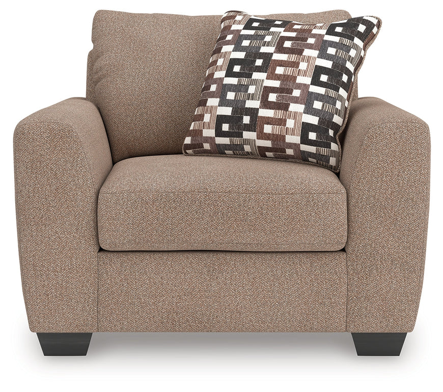 Transitional and right on trend. This oversized chair's upholstery is a delightful change from the ordinary, with hints of soft brown giving the gray hue added depth. It’s punctuated with a chic accent pillow in an eye-catching, stylized stripe design. Whether you're hosting friends and family or relaxing solo, this chair invites homey, comfortable character into your space.