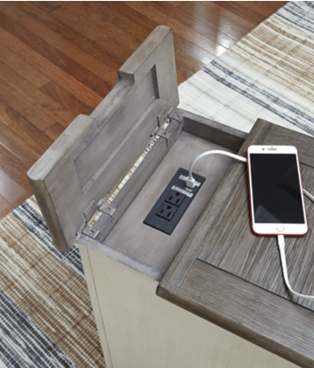 • Lift-top back revealing 2 electrical outlets and 2 USB charging stations