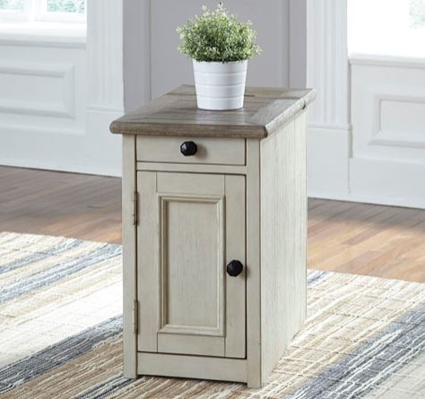 Display and contain your favorite things with the Bolanburg Chair Side Table. Its textured antique white finish creates a vintage two-tone look, while outlets and USB ports provide functionality. This is a piece you will enjoy for years to come. Pull-out tray Minor assembly required Two-tone antiqued finish Lift-top back...