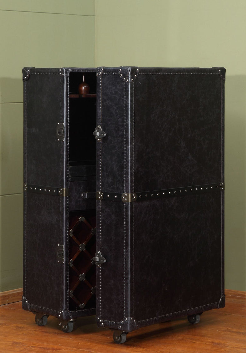 The Gramercy wine cabinet may be slight in stature, but it’s big in function, as is immediately apparent as soon as the piece swings open. On the left side is a rack that holds nearly two dozen wine bottles, topped by a stemware rack plus three handy drawers. On the right of the cabinet is vertical storage for oversized wine bottles, plus additional storage. Beautiful inside and out, the cabinet is covered in premium, top-grain leather with nailhead details and casters for easy mobility.