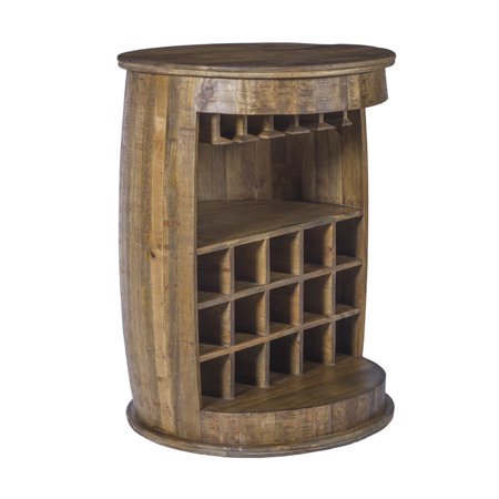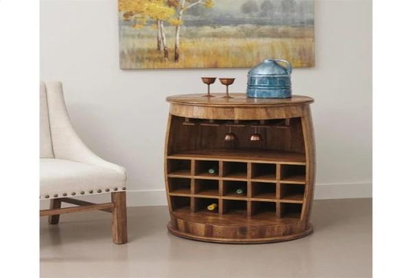 Fine wines are often aged for years in casks of wood in underground vaults. We have recreated the look in a bold and playful fashion, a delightful wine server complete with hanging glass racks on the top and bottle storage below - but from the other side no one would know! Finished in our rich Makers Brown to let the wood grains gleam, a spirited addition for your game room, den or kitchen.