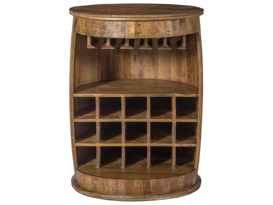 Fine wines are often aged for years in casks of wood in underground vaults. We have recreated the look in a bold and playful fashion, a delightful wine server complete with hanging glass racks on the top and bottle storage below - but from the other side no one would...