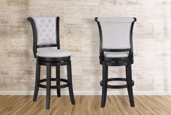 The Granville Swivel stool is beautifully crafted. With a button tufted full height back, nail head trim detail, and cushioned upholstered seat, it provides a classic look that adds a touch of sophistication to your space. Upholstered in a soft dove gray upholstery makes this a versatile piece for a variety of decor styles. A 180 degree swivel and wood footrest offer accessibility and comfort. Full assembly required.
