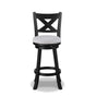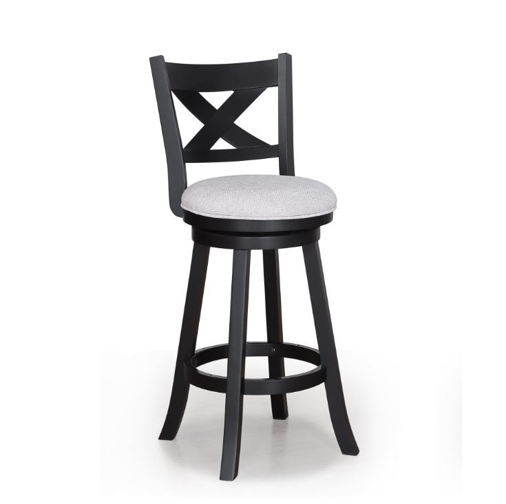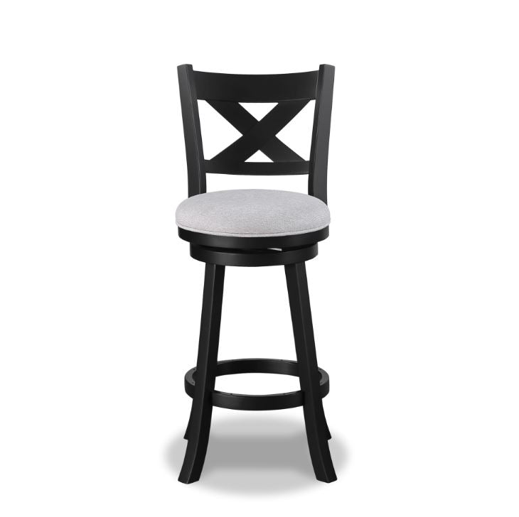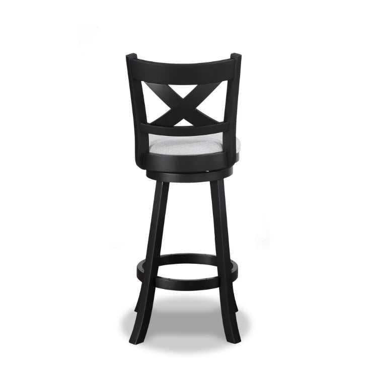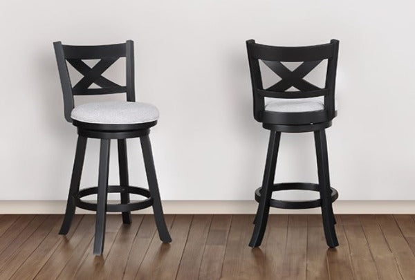 Introducing a touch of rustic charm mixed with urban sophistication, these bar stools are a perfect blend of style and functionality. The rich, deep wood finish accentuates the intricate cross-back design, adding a visually captivating element. Paired with soft dove gray upholstery, these stools ensure both comfort and elegance.
