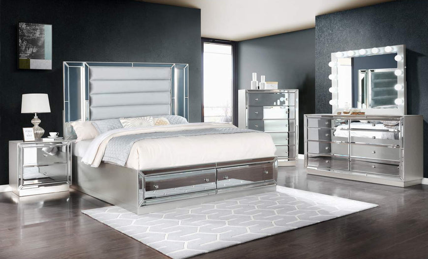 Your bedroom should be a representation of yourself, and if you're all about the glitz and glam of life, this Aurora collection is perfect for you. With details such as a stunning silver finish, Led lights in the headboard, mirrored accent panels, led light under the nightstand, and two storage drawers in...
