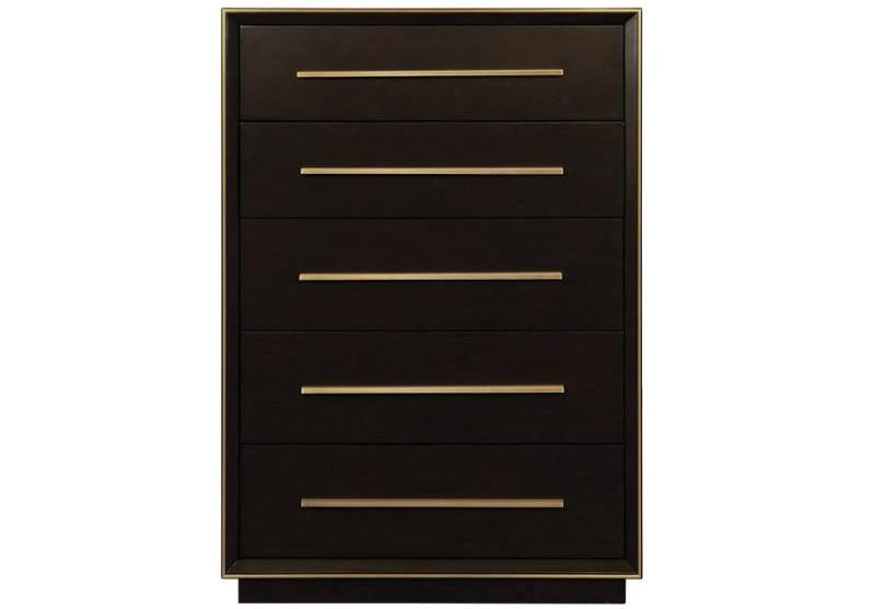 The Dexter Collection introduces modern, linear symmetry with elegant wood and metal details. Case fronts feature metal trim that makes a sleek statement for the collection. Vaulted headboard creates dramatic height. Enjoy this exclusive design that also offers floor mirror.