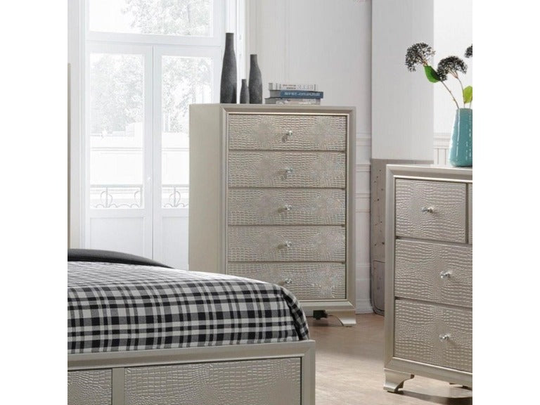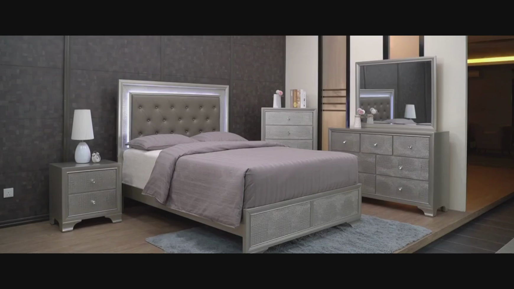 This glamorous bedroom collection features an embossed crocodile finish, decorative knob hardware, and contemporary clean lines. The centerpiece of the collection, the stunning bed, has a diamond tufted headboard surrounded by LED back lighting. Storage pieces have durable dovetail drawers with metal glides.