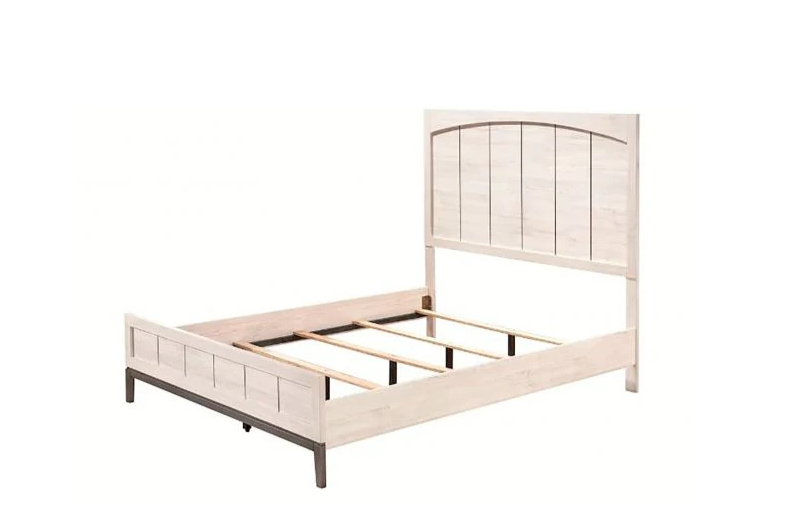 Experience the blend of minimalism and elegance with this chic bedroom ensemble. Crafted with a light and airy finish, it creates an inviting atmosphere while the sleek lines and subtle contrasts in color emphasize a modern aesthetic. Each piece showcases thoughtful craftsmanship with unique drawer pulls that add a touch of character. The gracefully arched headboard anchors the space, offering a serene focal point.