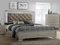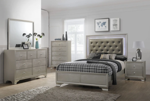 This glamorous bedroom collection features an embossed crocodile finish, decorative knob hardware, and contemporary clean lines. The centerpiece of the collection, the stunning bed, has a diamond tufted headboard surrounded by LED back lighting. Storage pieces have durable dovetail drawers with metal glides.