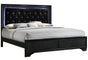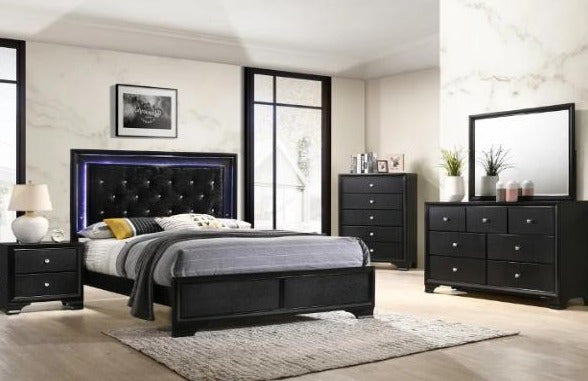 Introduce a bold touch of glam into your space with this gorgeous black finished bedroom collection. The LED backlit bed is perfect for the daring types with its velvety upholstered headboard and chic crystal button tufting. The footboard and drawer fronts are adorned with textured panels, adding to the striking...