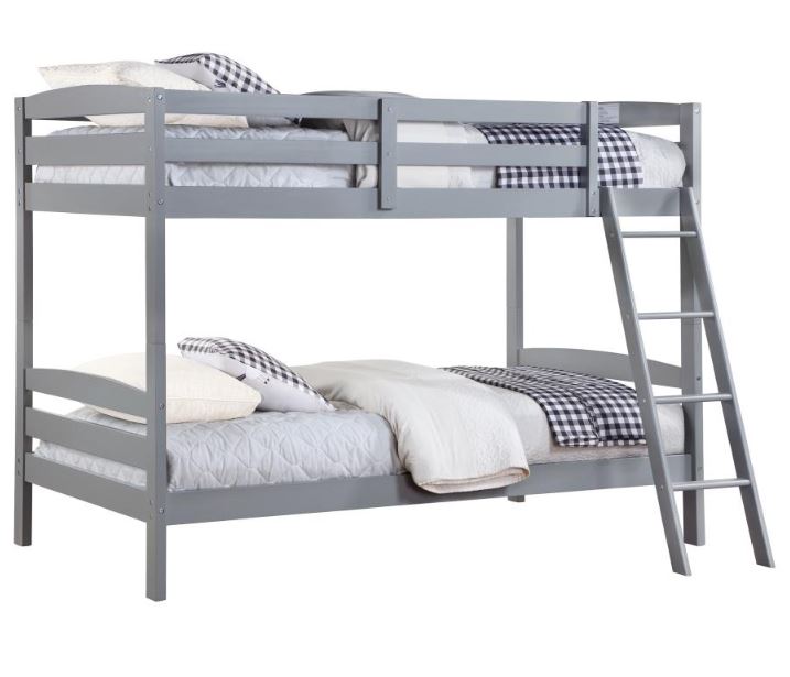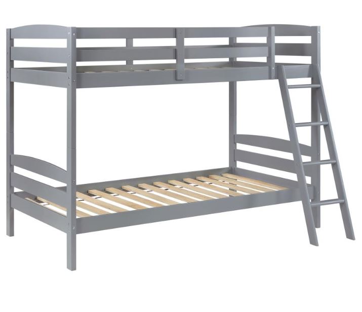 Double the sleeping space in your child's bedroom or a guest room with a modern twin bunk bed. Perfect for two, it includes a modern grey finish over wooden construction for a clean look that blends into surrounding decor with ease. The bed features gently arched head and footboards, each with an open, slatted design. The upper bunk includes safety rails and a ladder for easy access. This bunk bed is the perfect upgrade for a kid's bedroom, offering a great place for a sleepover with friends or easing space concerns in a room shared by siblings.