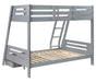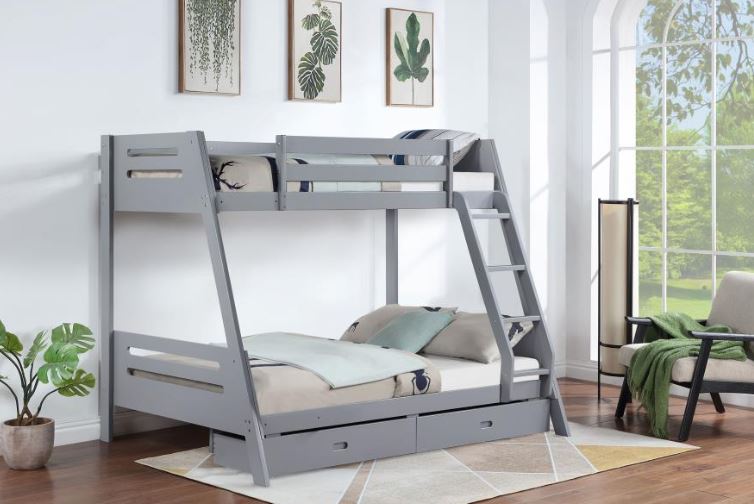 Reimagine a kid's bedroom with the versatility of a modern twin-over-full bunk bed with drawers underneath. Perfect for a range of spaces, it's a great choice for guest accommodations, siblings sharing a room, and sleepovers with friends. The bed boasts wooden construction with a soft grey finish that instills contemporary flair. The upper twin bed includes safety rails and a ladder that installs on either the left or right to best suit your space. Under the lower full bed, two drawers create added storage, perfect for linens, seasonal clothing and much more.