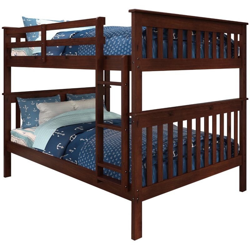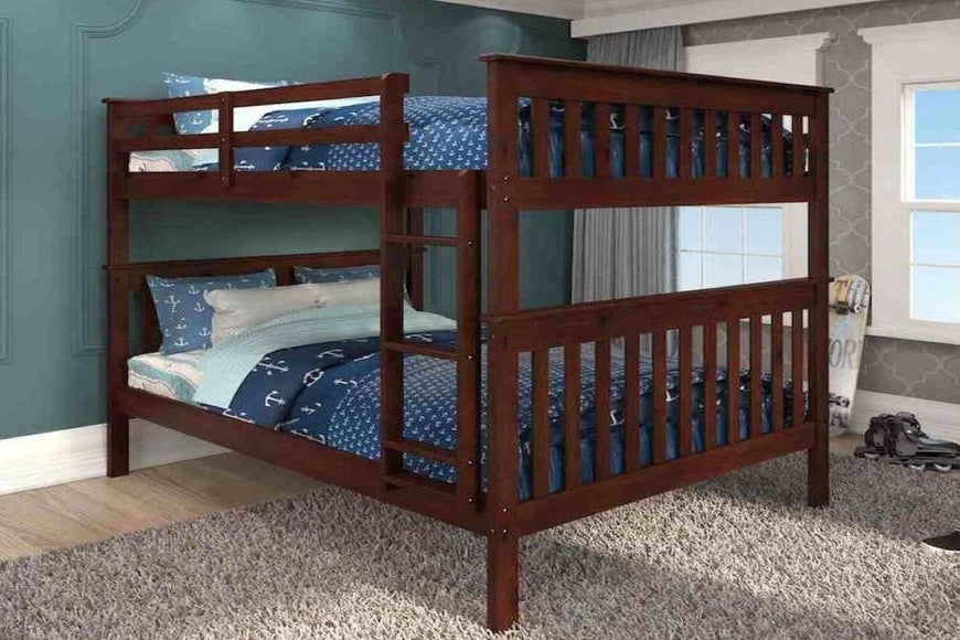 Full Over Full Mission Style bunkbed and the Cappuccino finish will add warmth to any bedroom. This bed comes with a mattress-ready slat system, so no Bunkie board is required.  Dimensions 77.75"D x 58.125"W x 62.25"H