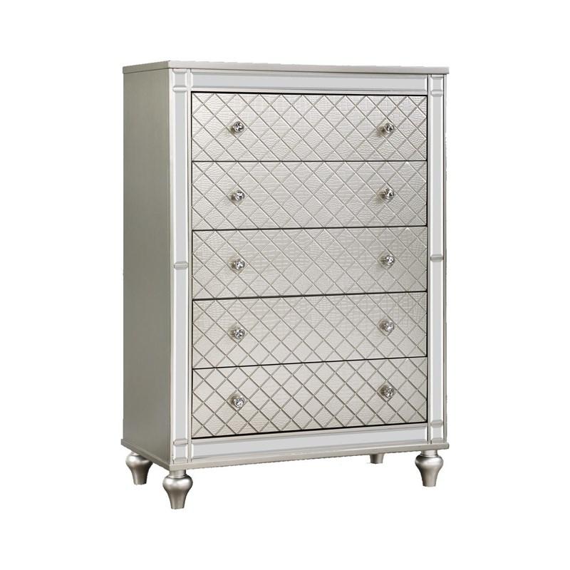 The Cristian Nightstand will make a great addition to your bedroom. It features mirror accents, turned feet, a crosshatch pattern on the drawer fronts, and comes in a champagne finish.