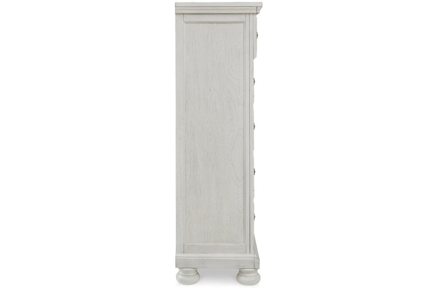 Elegant, timeless furnishings take your bedroom to the next level. Nothing does that better than the Dale chest. The antiqued white finish with a wonderful grain texture oozes sophistication, while the dark bronze-tone hardware adds an ornate touch. A felt-lined top drawer rounds out the piece for the ultimate tasteful bedroom.