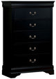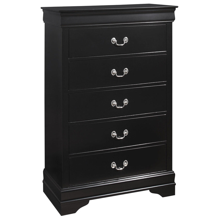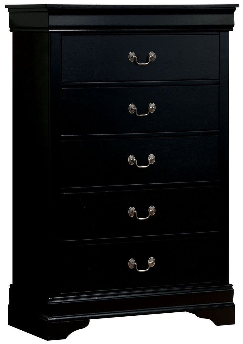 The Five Drawer Chest is an enchanting addition to your sleeping space. Made with select hardwoods and a black finish, this piece is warm and matches well with any décor. This piece has beautiful features such as simple molding at the top, metal bail handles and bracket feet. Use the five...