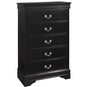 The Five Drawer Chest is an enchanting addition to your sleeping space. Made with select hardwoods and a black finish, this piece is warm and matches well with any décor. This piece has beautiful features such as simple molding at the top, metal bail handles and bracket feet. Use the five drawers to store clothing items or extra blankets. For style and storage, this chest is sure to please.