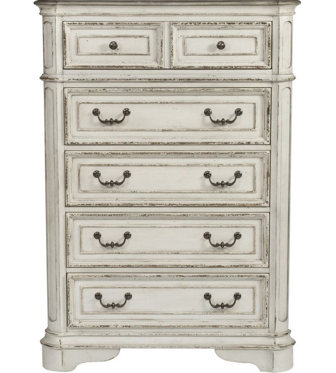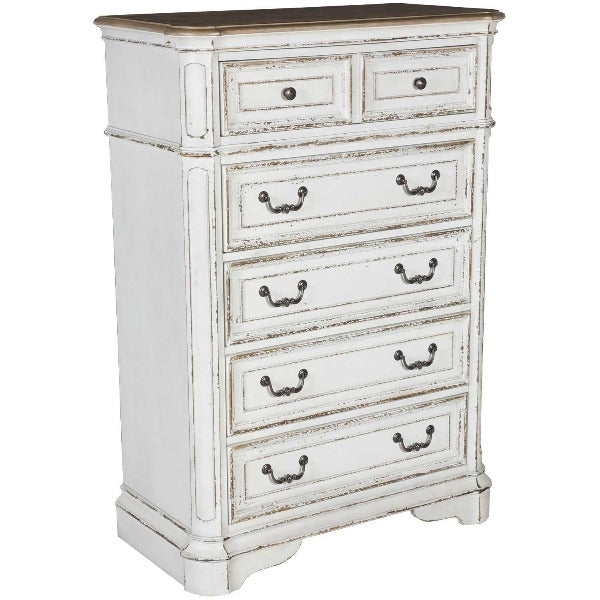 Elevating the art of traditional cottage styling, the Magnolia chest of drawers is your dream bedroom retreat realized. Antiqued two-tone aesthetic blends a chipped white with a distressed wood finished top for added charm. Framed drawer fronts and decorative corbels add refinement, while bail pulls in a dark bronze-tone finish lend a classic touch. Chest features 5 smooth-gliding drawers with dovetail construction and the top drawer is felt lined