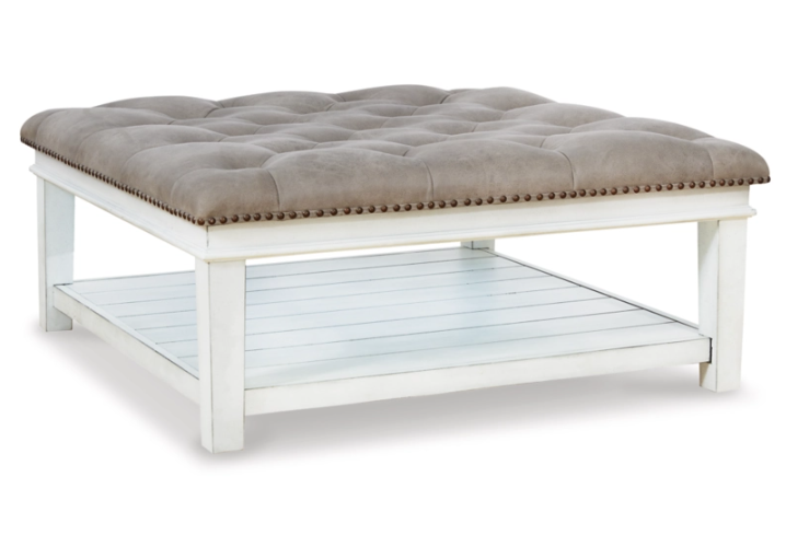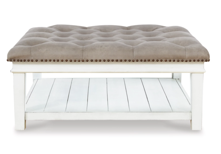 Ideal as a footrest or coffee table stand-in, this ottoman coffee table adds an all-purpose farmhouse touch to your living space. Crafted with comfort and convenience in mind, this square ottoman features a faux leather button tufted seat with nailhead accents. Enhancing its casual appeal, a handy lower shelf houses throws, reading material and other essentials.