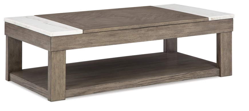 Welcome casual, contemporary style and functionality to your home. This lift-top coffee table is equipped with a convenient lift-top surface for working or dining from your sofa, as well as a spacious lower shelf to display treasured items. Natural white marble accents deliver a mixed-material vibe, while the grayish brown...