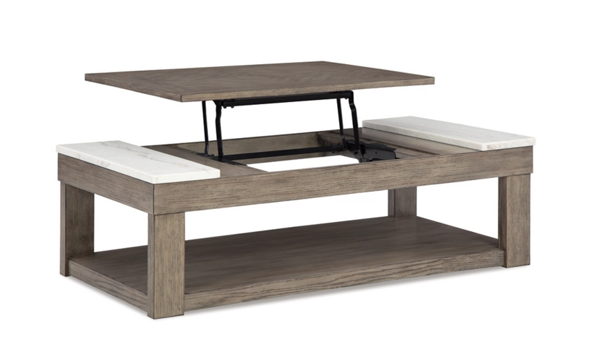 Welcome casual, contemporary style and functionality to your home. This lift-top coffee table is equipped with a convenient lift-top surface for working or dining from your sofa, as well as a spacious lower shelf to display treasured items. Natural white marble accents deliver a mixed-material vibe, while the grayish brown finish lends a laid-back look that’s so welcome at the end of a long day. Casters allow you to move the table whenever and wherever it’s needed.