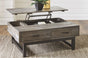 Love the industrial look? Make it work with this lift top coffee table. Turning what’s old into something fresh and new, it’s crafted of reclaimed wood, beautified with butcher block styling and a gray-tone distressed finish. The table’s split design features a spring-lift top on one side and a fixed surface on the other, along with a pair of deep drawers for handy hideaway storage. Finished in matte black, the table’s ultra-linear metal base provides a striking contrast.