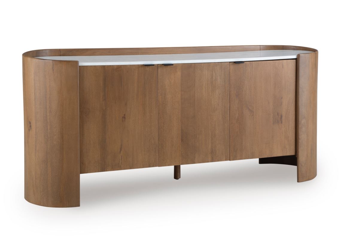 This stunning accent cabinet combines modern design with sophisticated materials. Its natural finish and sleek white marble top create an elegant contrast, while the unique, rounded silhouette adds a touch of contemporary flair. Three doors open to reveal shelves and storage space, making this piece as practical as it is...