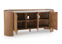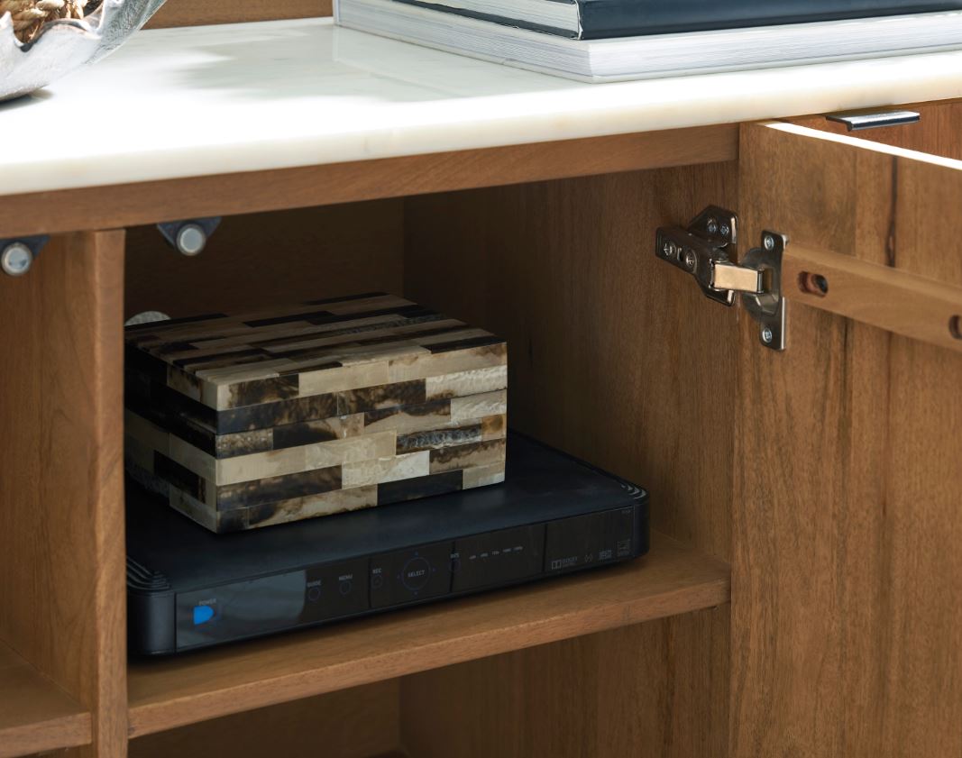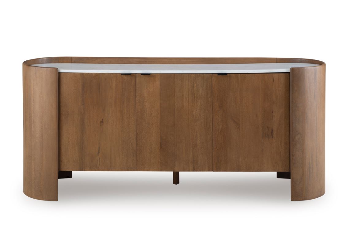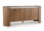 This stunning accent cabinet combines modern design with sophisticated materials. Its natural finish and sleek white marble top create an elegant contrast, while the unique, rounded silhouette adds a touch of contemporary flair. Three doors open to reveal shelves and storage space, making this piece as practical as it is beautiful.