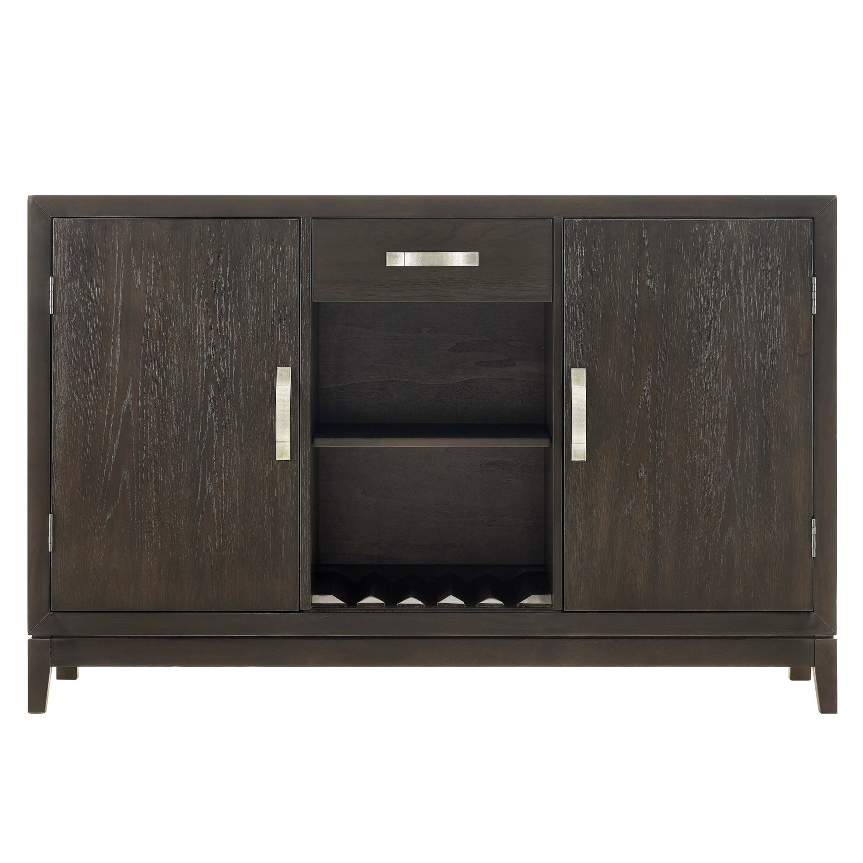 Enhance your dining or living space with this sophisticated and functional storage solution. Designed with a sleek, modern aesthetic, it features a rich, dark finish that exudes elegance while complementing a variety of décor styles. The spacious cabinets provide ample room for dinnerware, glassware, or entertaining essentials, while the open shelving is perfect for displaying your favorite bottles and décor accents. A convenient drawer adds extra storage for smaller items, keeping your space organized and clutter-free. Accented with stylish metal hardware, this piece effortlessly combines practicality with timeless charm, making it the perfect addition to any home.