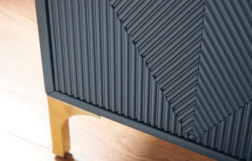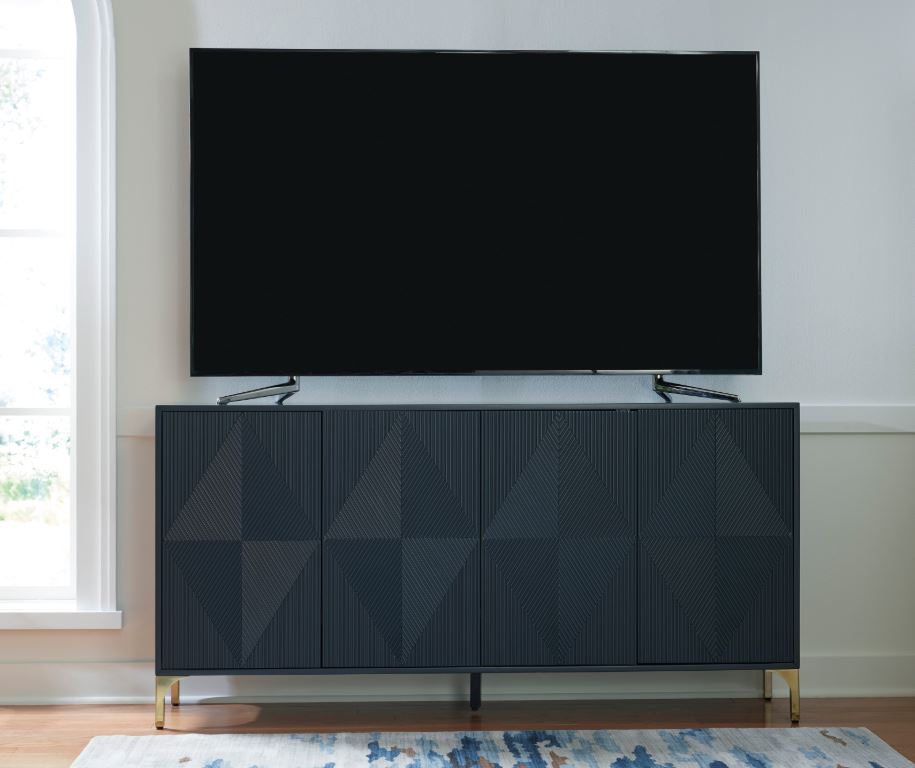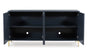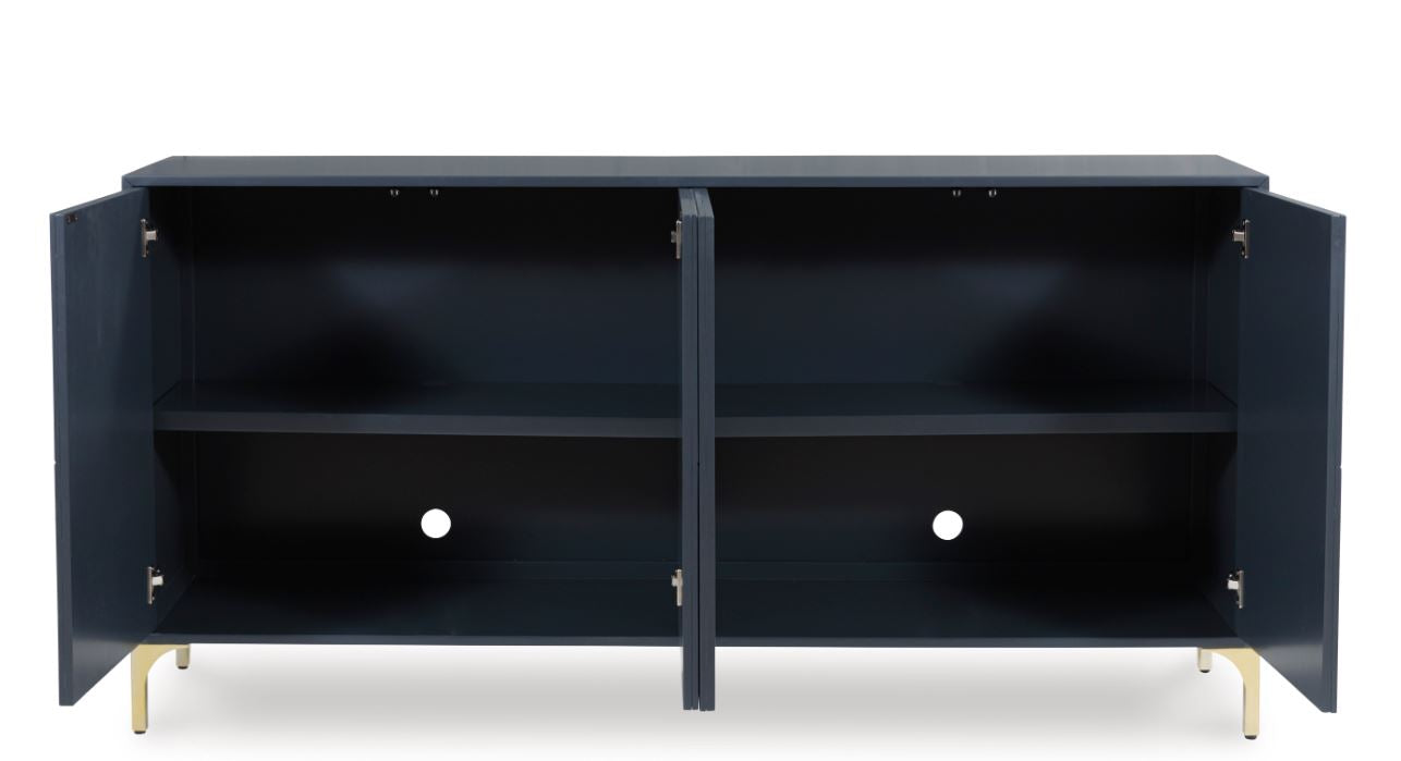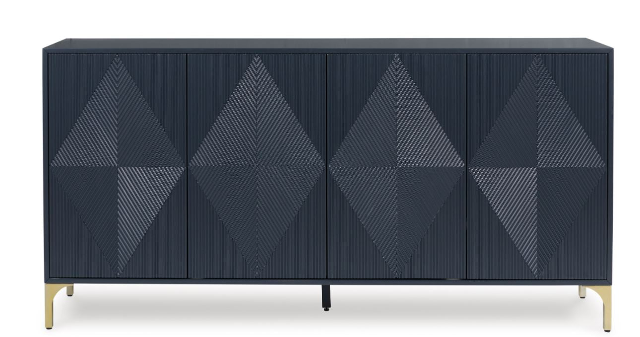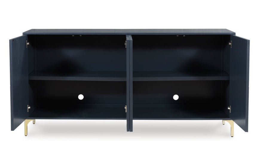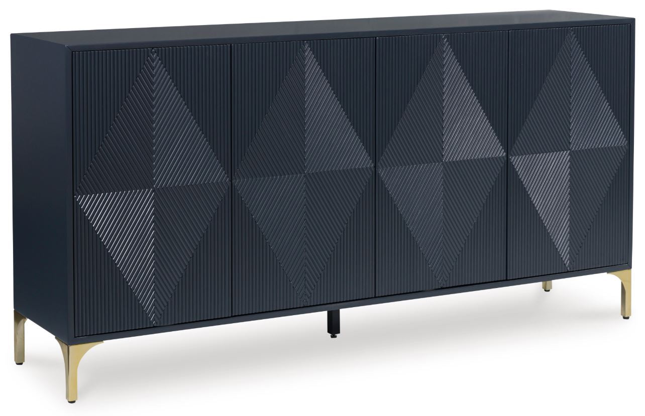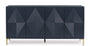 Elevate your aesthetic with the chic design of this accent cabinet. Sleek goldtone legs and striking doors with a geometric pattern infuse contemporary flair wherever you place this piece. Add a dark blue finish, and you've got a stunning showstopper. Providing function to form, the cabinet's push magnetic doors reveal two shelves and openings for electronics.
