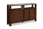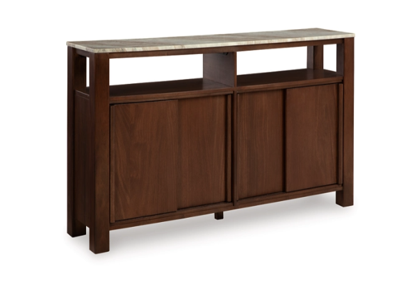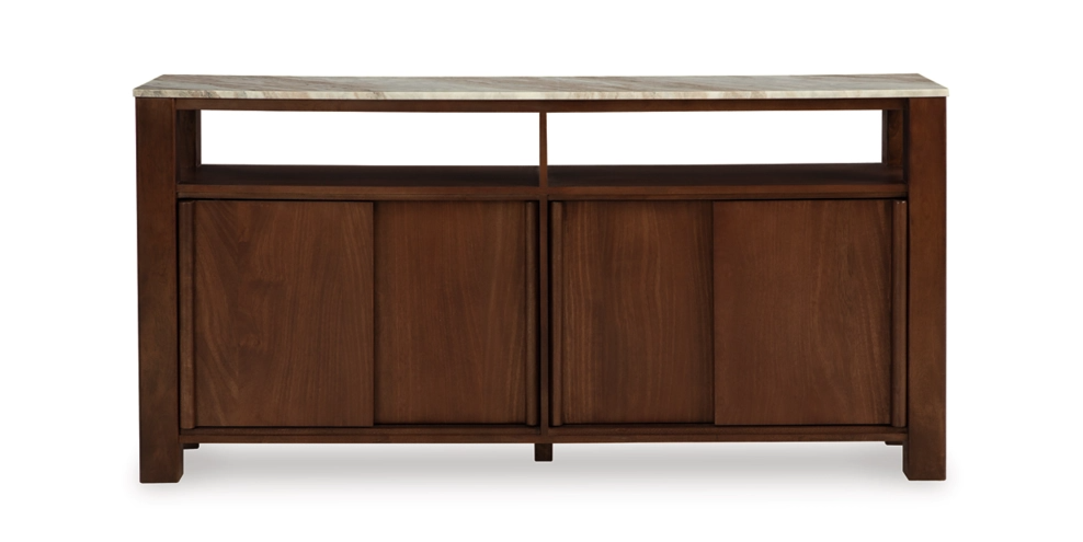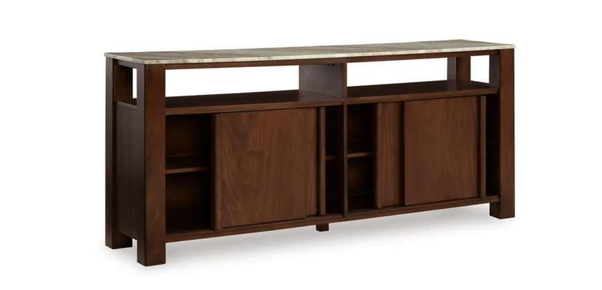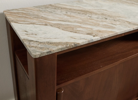High style and functionality? Check and check. This accent cabinet's taupe, white and gray marble top and contrasting dark brown finish bring the wow factor. Sliding doors open to reveal shelves that are perfect for hiding everyday clutter. Whether you use it for storage or as a TV stand, this showpiece creates contemporary elegance with ease.