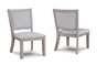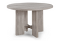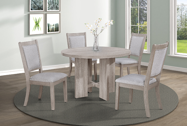 This charming dining set exudes a coastal-inspired aesthetic, perfect for creating a light and airy dining atmosphere. The set centers around a round table with a weathered wood finish, offering a casual yet refined dining surface that invokes a sense of beachside serenity. Complemented by a set of elegantly crafted chairs, each piece showcases a gentle fabric upholstery in a calming neutral tone, providing comfortable seating that invites diners to linger longer. The chair backs' subtle curvature and the table's sturdy pedestal base combine to create a cohesive look that balances rustic textures with clean, contemporary lines.