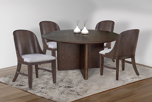 Bring refined elegance to your dining space with this sophisticated and contemporary dining group. Featuring a beautifully crafted round table with a rich woodgrain finish, it creates a warm and inviting atmosphere for meals and gatherings. The bold pedestal base adds a modern touch while providing sturdy support. The matching...