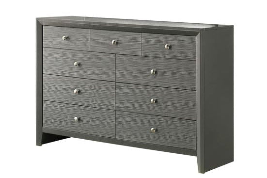 The Denker Dresser will surely make a statement in your bedroom. It features nine drawers with round knobs, a wood-like pattern on the drawer fronts, and comes in a Gunmetal finish.