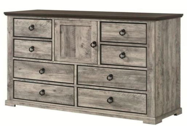 The Ella-Mae dresser features a rustic gray wood finish with a contrasting dark top for a warm, timeless look. Its combination of drawers and a center cabinet provides practical storage for everyday essentials. Classic ring-pull hardware completes the charming farmhouse style.