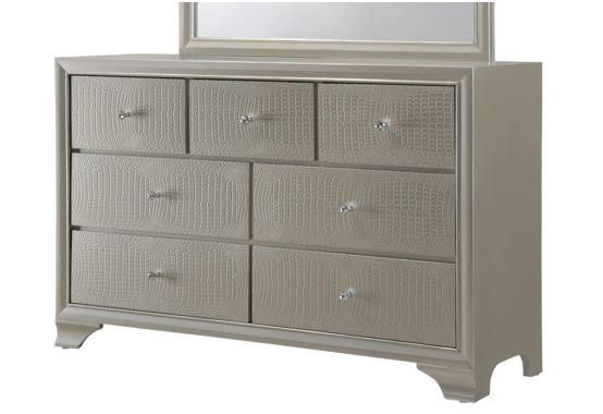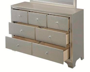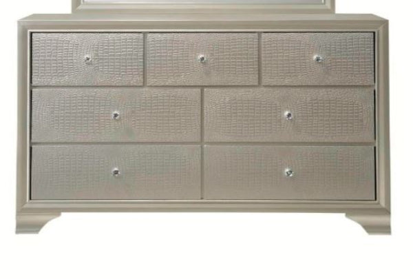 This glamorous dresser features an embossed crocodile finish, decorative knob hardware, and contemporary clean lines. The dresser includes durable dovetail drawers with smooth metal glides, offering both stylish appeal and functional storage.