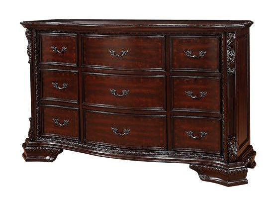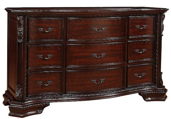 Traditional elegance will be brought to a whole new level with the exquisite Maddison dresser. This piece carries a warm brown cherry finish and include several distinct features, including ornate wood carvings, crowned top and roped detailing.
