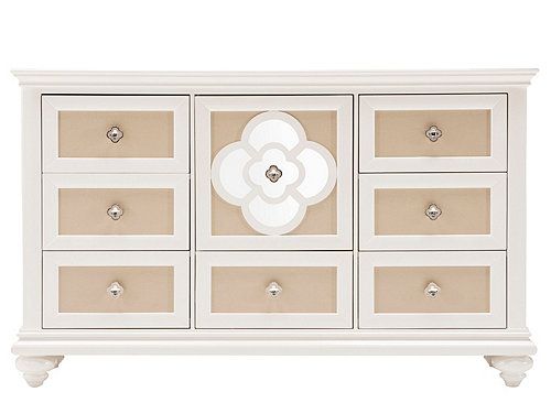 This chic and feminine dresser is extra-customizable as you can choose the look by switching the reversible drawer fronts to show salmon-colored faux leather or matching wood in Pearl finish. Crystal-like clover drawer pulls, clover leaf carving, and reflective insert panels give this storage piece gorgeous cottage style that's the perfect fit for your daughter's room.