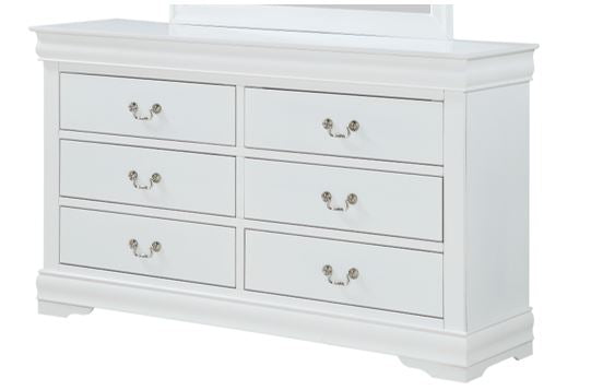 Bring home the casual elegance of the Philip White Dresser. This Dresser's brass and silver bail handle hardware accents the crisp white finish. Made with select hardwood and veneers, this 6 drawer dresser offers great storage capabilities all with a casual traditional style. This versatile Philip Dresser will complete your master bedroom whether your style is traditional or more on the luxurious side!!