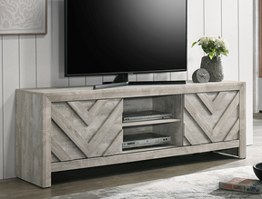 Discover the epitome of rustic elegance with this captivating entertainment console, designed to anchor your living space with its distinct and artful presence. The washed wood finish offers a serene, natural aesthetic that brings the essence of a tranquil retreat into your home. The geometric chevron patterning on the cabinet doors adds a touch of modern sophistication, making it a versatile piece that complements both contemporary and traditional interiors. Function meets form as this console provides ample space for multimedia devices, gaming consoles, and other essentials, all while maintaining a clutter-free environment..