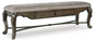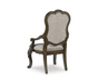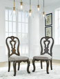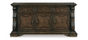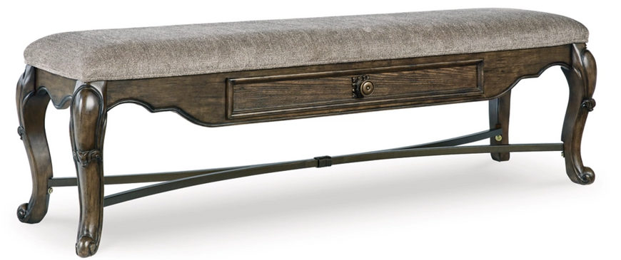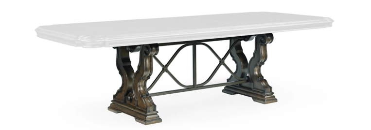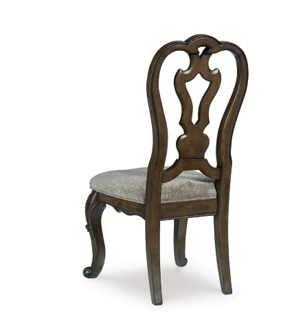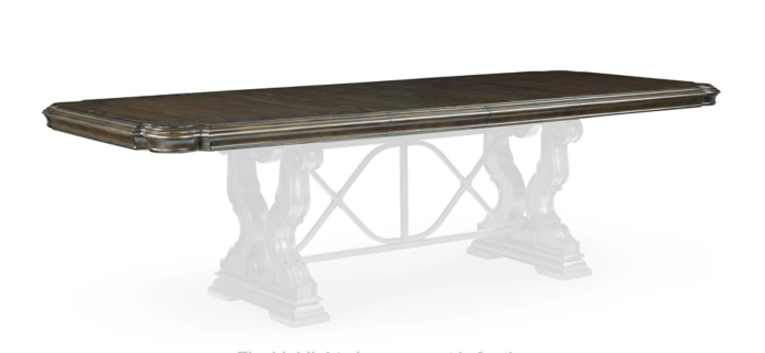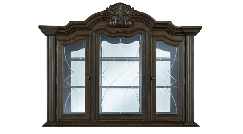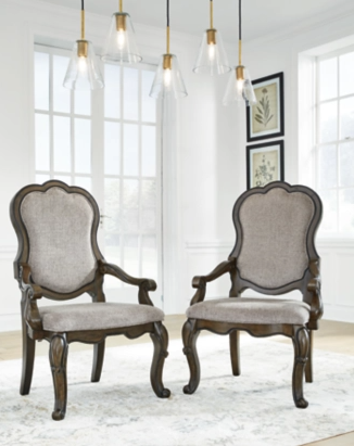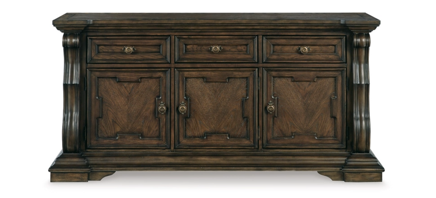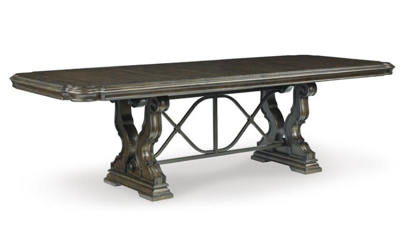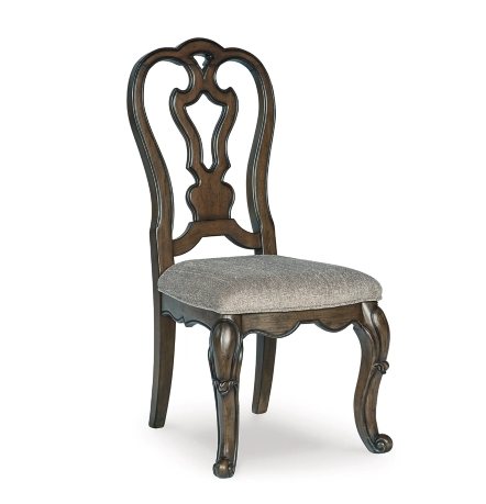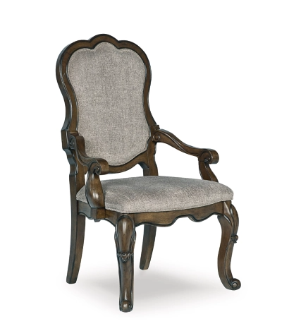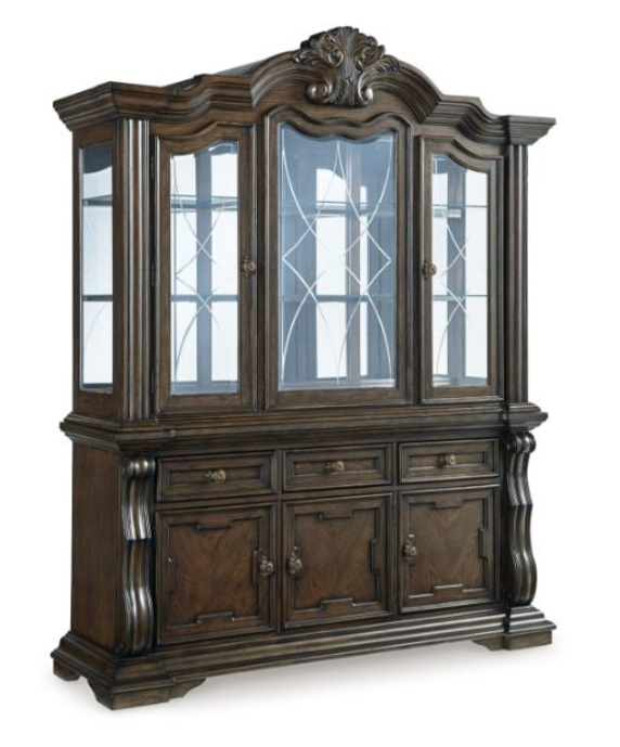 Opulent Traditional styling. Inspired by the grandeur and grace of Old World traditional style, this dining room collection is nothing short of stunning. A choice blend of materials is accented by detailed ornamental appliques large scaled decorative pilasters and ornate cabriole legs. Made with hardwood solids, oak and ash swirl veneers with MDF substrates and cast resin components. Finished in a dark brown coloration. Dining table features a shapely table top with Ash swirl borders that sits on a double pedestal base with cast ornate design and a decorative metal stretcher. The host's chair features a beautiful ornate arms with back cushion and plush seat covered in a softly textured pewter colored chenille and cabriole legs. Side chairs have a traditionally styled back rest with a cushioned seat covered in a softly textured pewter colored chenille and cabriole legs. Dining bench (sold separately) features ornately shaped legs, a metal accent stretcher and storage drawer with fully finished drawer interior. Complete the opulence in your dining collection with the large buffet and China deck. Buffet top is fully finished with matching ash swirl veneer border.