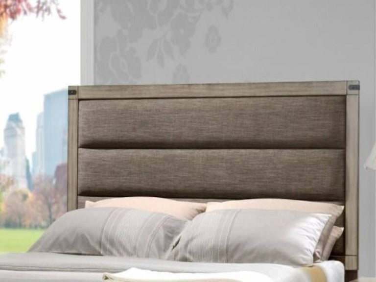 This contemporary bedroom collection features a fresh grey finish and simple clean lines. The centerpiece of the collection is the sleek low profile bed with an upholstered headboard. A nightstand, chest of drawers, and dresser provide plenty of convenient bedroom storage space.