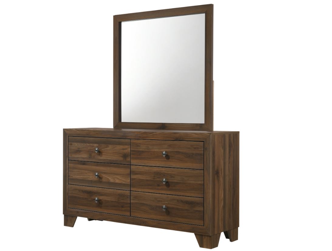 Bring a fresh new style and the sweetest of dreams to your bedroom with the Millie Bedroom Set.. The clean lines and simple transitional style will complement just about any taste - from traditional to modern room designs. The panel bed features framed details along the headboard and footboard and tapered feet. The dresser with attached mirror also features the same framed detail around the attached mirror.Â