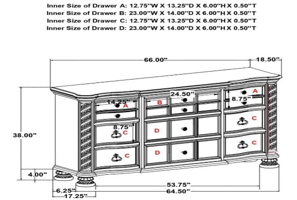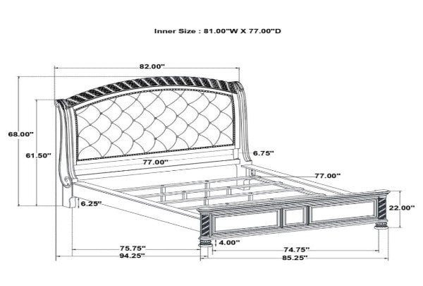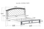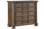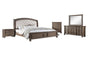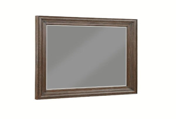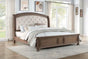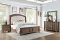 A transitional bedroom with a traditional design featuring an arched headboard that is button-tufted as the centerpiece. Finished drawer boxes include brown felt-lined top drawers. The nightstand's top drawer has cord access for personal electronic charging. The wire-brushed surface has a beautiful vintage finish with faux wood carved columns and details. This set includes the bed headboard, footboard and rails, a nightstand, a dresser and a dresser mirror. Chest is sold separately.
