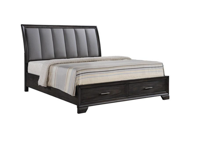 This bedroom set offers a sleek and stylish update to any space, featuring a rich, dark finish that commands attention while maintaining a sense of warmth and coziness. The bed stands as the stunning centerpiece, with its high, padded headboard upholstered in a plush fabric that invites relaxation and comfort. Flanking the bed are matching nightstands, providing convenient access to storage and display space. The set is rounded out with a capacious dresser, accented with a broad mirror that adds depth and brightness to the room.
