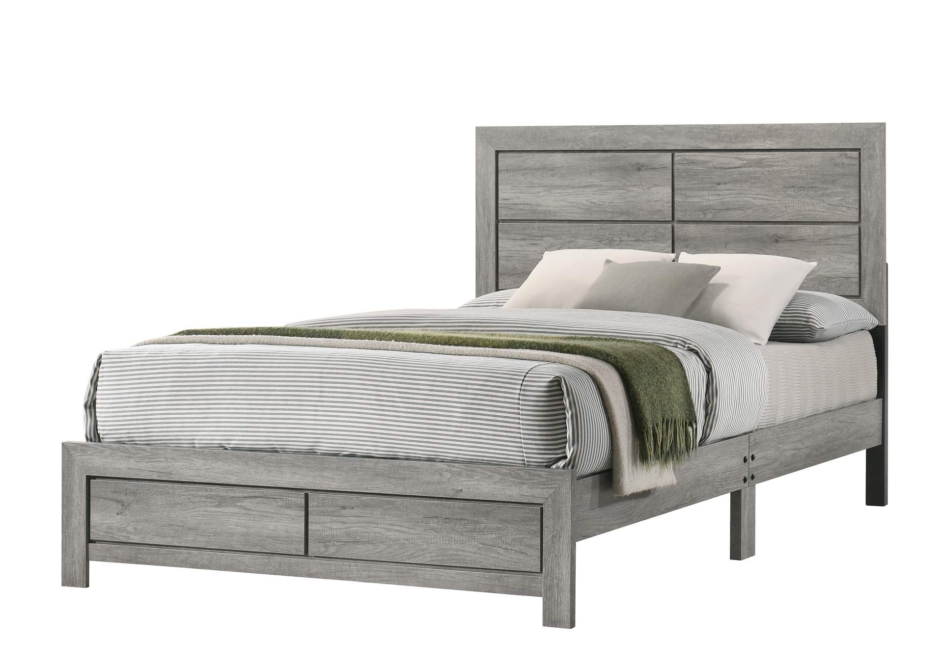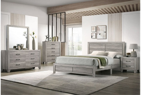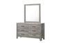 You’ll dream in style in the casual contemporary Hopkins platform bedroom set. A vibrant grey finish with clean lines adds to this stylish set along with the four-paneled headboard and platform base. Each piece in the set is made from hardwood veneers and solids yielding a durable construction. The case pieces have silver metal hand pull hardware which contrasts the grey finish perfectly. The dresser has six drawers and is paired with a rectangular landscape mirror. The nightstand has two drawers for additional bedside storage space.