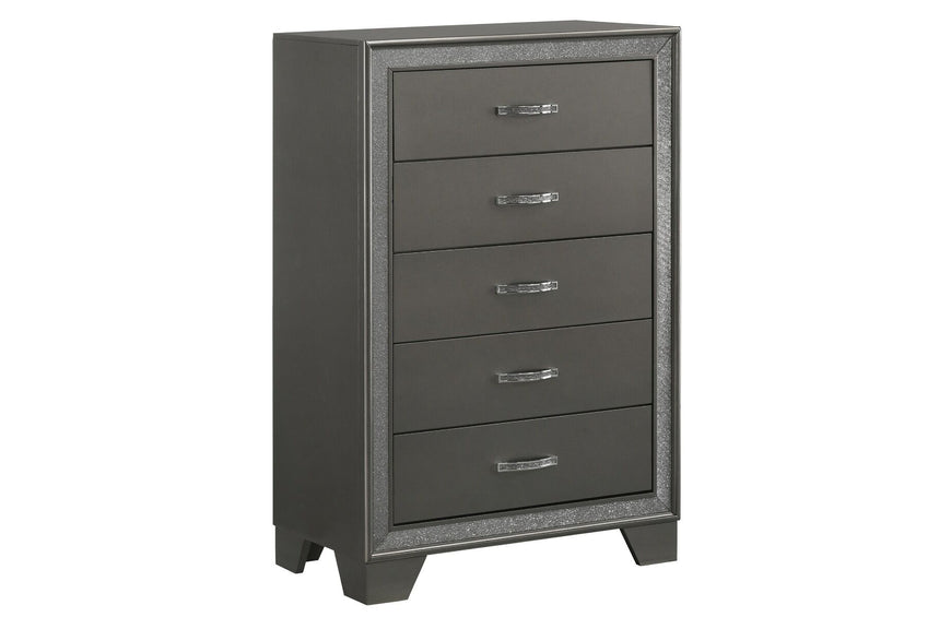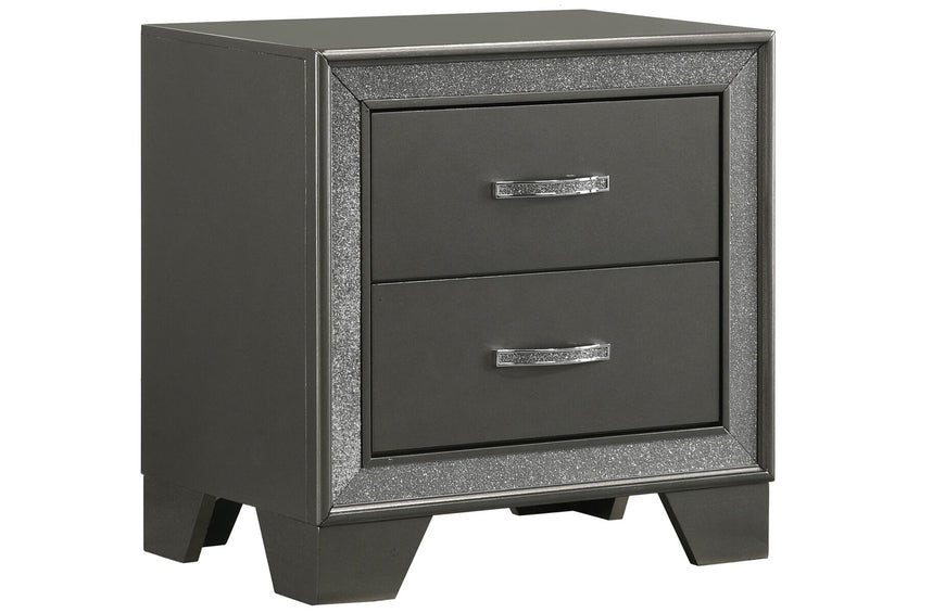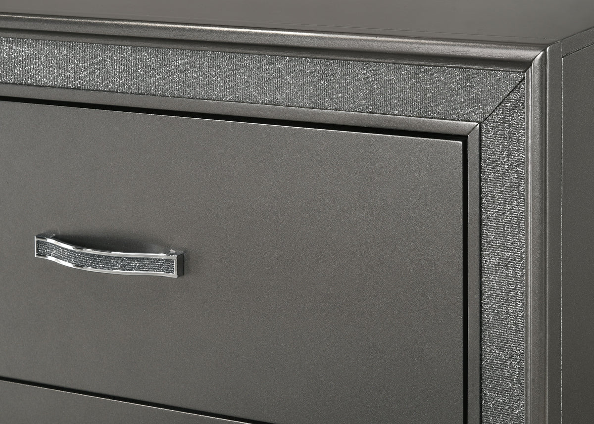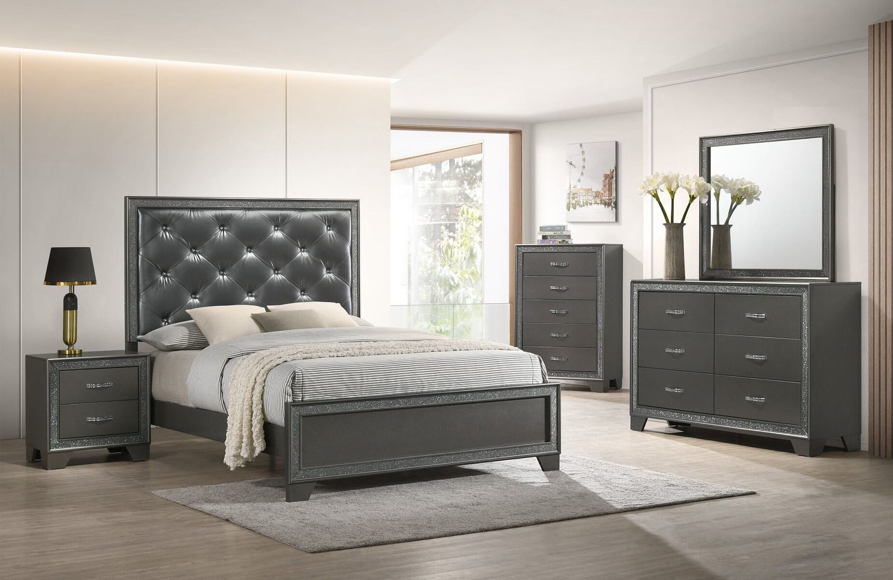 Relax in luxury at the end of your day in this glam panel bed. Reminisce on Hollywood's golden age with a button-tufted headboard accented by sparkling embellishments. A dark gray finish brings a modern edge to your bedroom enhancing a clean and sleek aesthetic.