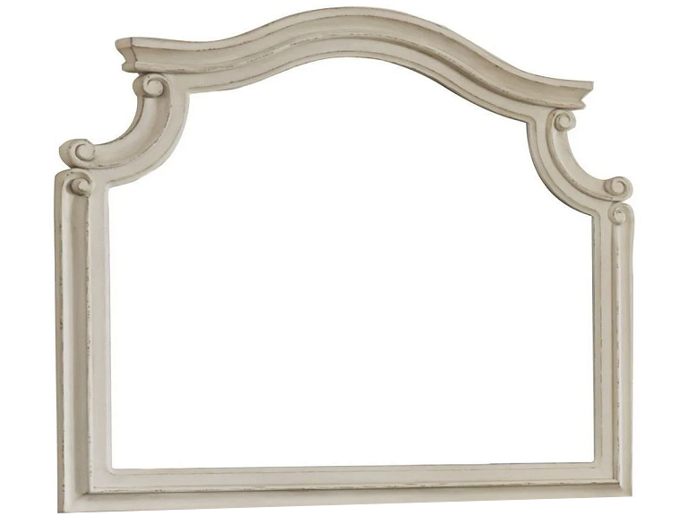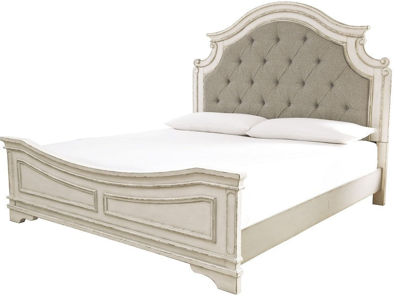 Elevating the art of traditional cottage styling, the Magnolia bedroom set is your dream bedroom retreat realized. A curvaceous beauty, this brilliant upholstered bed wows with dramatic scalloped details and fanciful trim work and charms with a distressed chipped white finish for heirloom appeal. Deep tufting on the cushioned upholstered headboard adds such a cozy element sure to put you at ease. Framed drawer fronts and decorative corbels add refinement, while bail pulls in a dark bronze-tone finish lend a classic touch. Subtly placed USB/electrical outlets in the nightstand meld vintage inspiration with modern convenience.